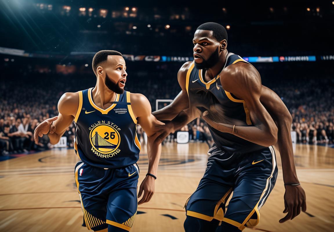 杜兰特与库里在篮球场上的身影,宛如两颗璀璨的明星,他们的每一次传球、跳跃和投篮,都让人充满期待。杜兰特的身影高大威猛,他的眼神坚定,每一次进攻都充满力量和决心。库里则以其敏捷的身手和精准的投篮闻名,他的眼神中透露着智慧和冷静。